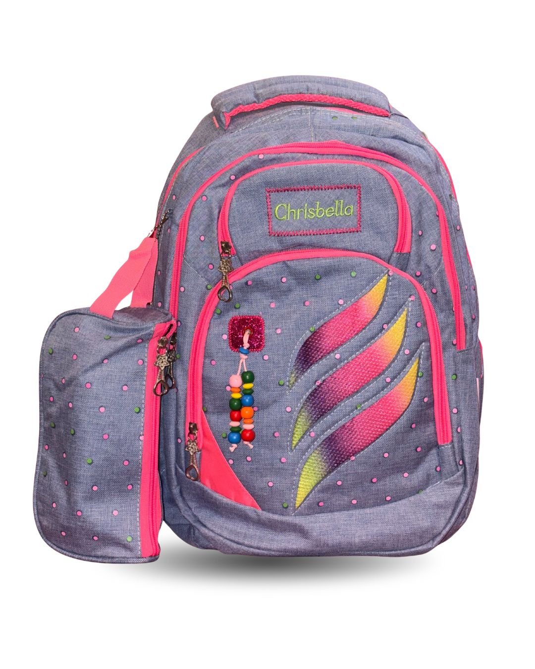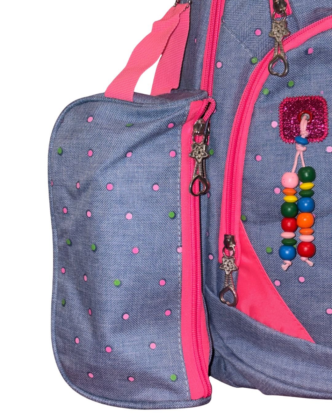 This vibrant blue backpack is designed for style, functionality, and comfort—perfect for school-going children. It features a playful and colorful design with decorative bead accessories and a front panel showcasing dynamic multicolor accents. Crafted from durable fabric with a textured finish, the backpack offers multiple compartments for organized storage. A matching detachable pouch adds extra convenience for carrying small essentials like pencils or stationery.