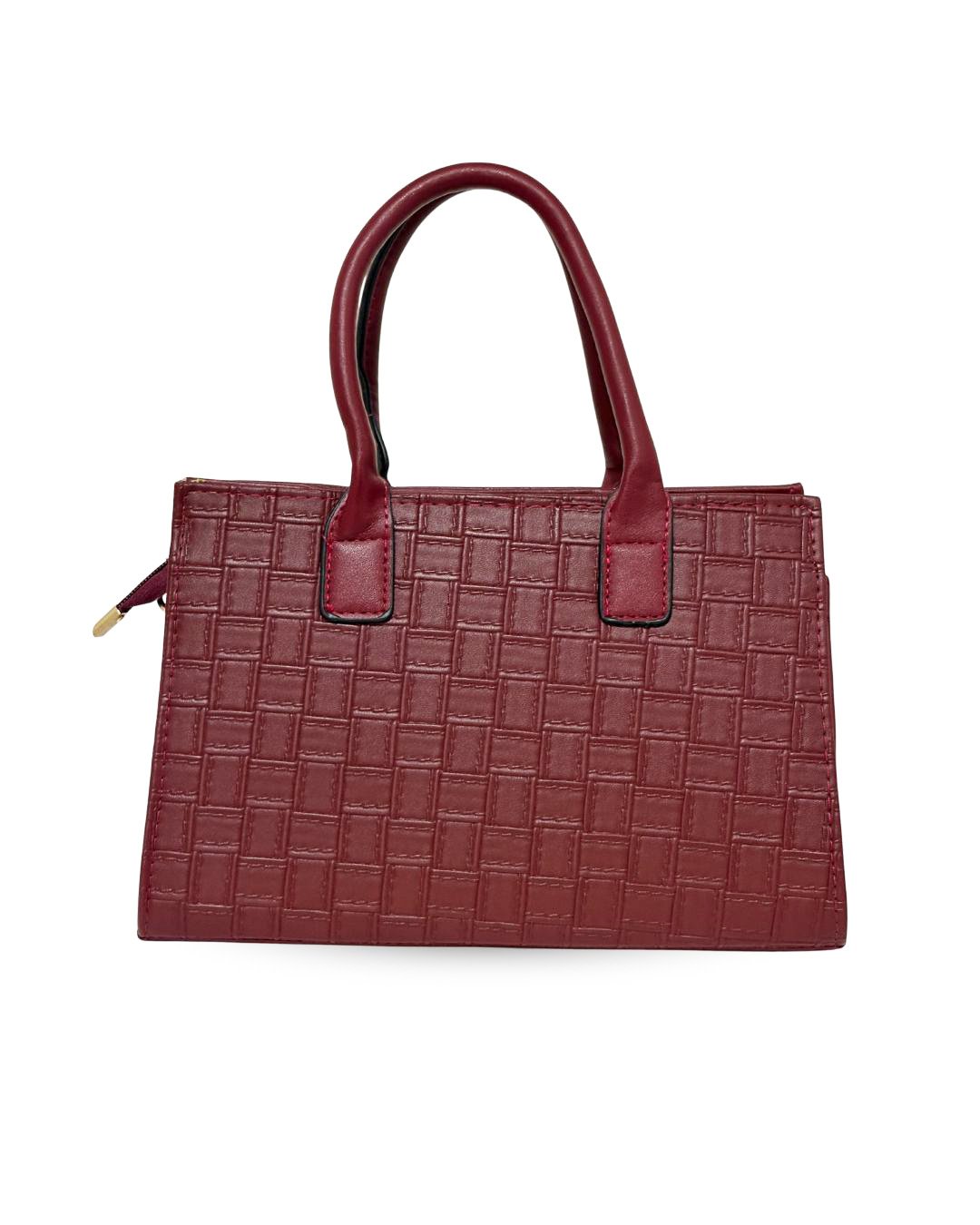 This elegant maroon textured handbag is designed for women who love a blend of sophistication and practicality. Featuring a premium square-pattern embossed surface, sturdy double top handles, and polished gold hardware, the bag offers a modern, classy look. The spacious interior includes multiple compartments—ideal for organizing your daily essentials such as a phone, wallet, makeup, and keys. A detachable adjustable long strap adds versatility, allowing the bag to be carried as a handbag or worn as a shoulder/crossbody bag. Stylish, durable, and functional, it’s perfect for office use, outings, and everyday wear.